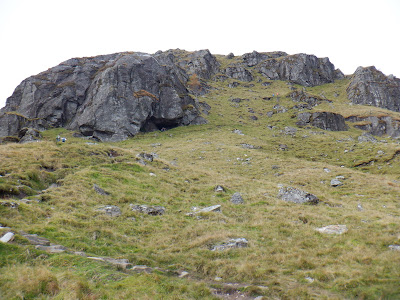 Started up Vane's grassy slopes, North, North East, then East along the cloud covered ridge to its small flat top. Set off down the walkers path through the small crags and gulley's busy with walkers.
